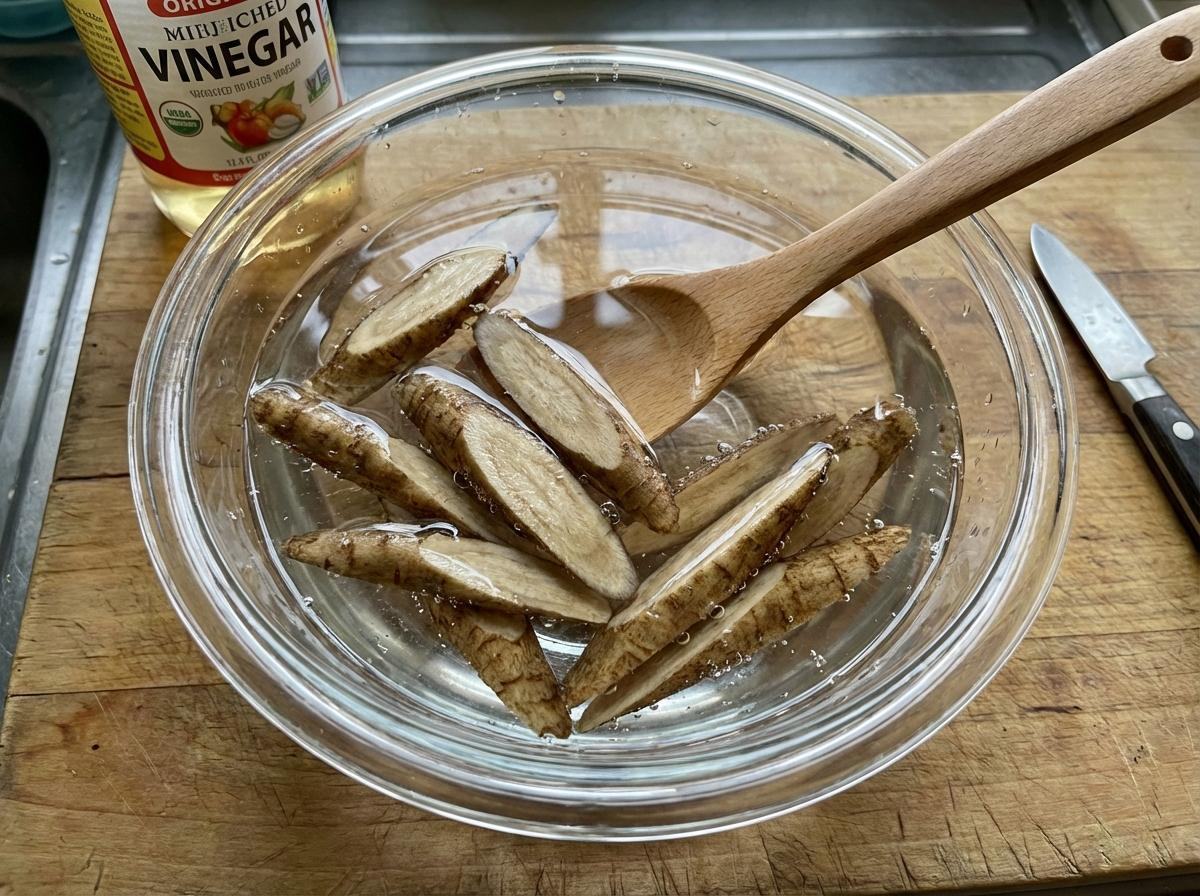 손질에서 맛이 갈린다. 우엉 껍질은 칼로 벗기지 않고 칼등으로 긁어내는 정도가 적당하다. 껍질 바로 아래에 향과 풍미가 몰려 있기 때문이다. 썰 때는 연필 깎듯 어긋썰기를 하면 표면적이 넓어져 튀겼을 때 식감이 좋아진다. 썬 우엉은 바로 식초를 약간 넣은 물에 5분 정도 담근다. 갈변을 막고 아린 맛을 줄이는 과정이다.