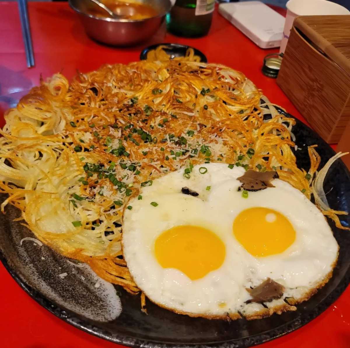 ‘엄마네돼지찌개’는 찌개와 짜글이의 중간 느낌으로, 돼지고기, 파, 양파, 두부 등이 들어 있는 매콤한 찌개이다. 단일 메뉴 하나로 유명해진 곳이며 한 입 먹으면 혀 끝부터 얼얼함이 밀려온다는데. 매운 맛 조절이 불가한 곳이지만 밥에 참기름과 콩나물 등을 넣어서 비벼 먹으면 어느정도 가감된다. 두툼한 계란 부침과 함께 먹으면 고소함이 더해지지만 그래도 매운 돼지찌개. 매운 맛을 즐기는 사람이라면 꼭 한 번은 가봐야 하는 곳이다.