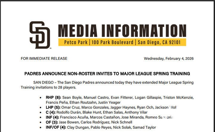 샌디에이고가 5일 ‘2026 스프링캠프 논로스터 초청선수 명단’에 28명의 선수를 포함시킨 가운데, 야수 중 특히 파블로 레예스와 호세 미란다 두 명이 눈에 띈다.