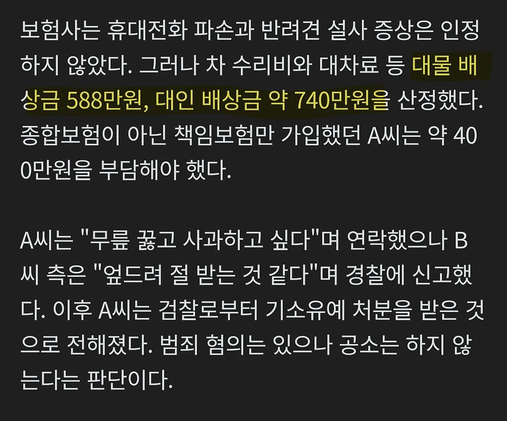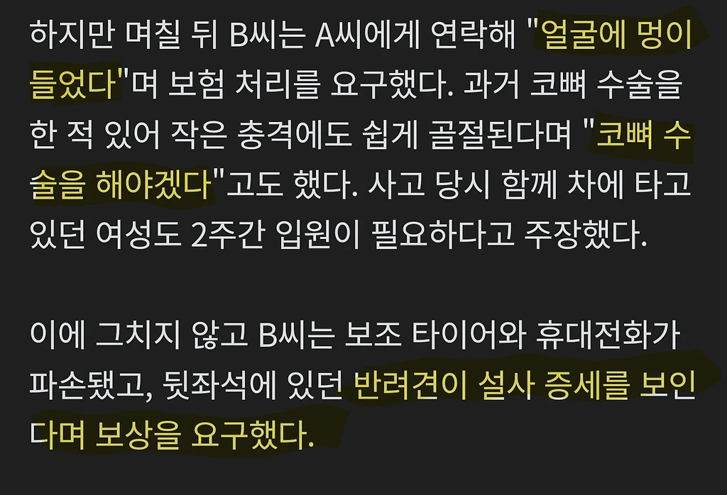 차에 콩 부딫힘 얼굴 멍, 코뼈골절, 배우자 2주입원, 휴대폰 파손, 반려견 설사증세 주장함 -> 보험사 산정 1,260만원 배상 현재 이마트 과자담기 1위 라는데해고당한 막내 직원 때문에 회사 박살나게 생김서울대 의대 수석합격자의 뼈때리는 일침현 지구 1짱 전투기는 뭐라고 보시나요도난당한 루브르 왕관 훼손된 모습