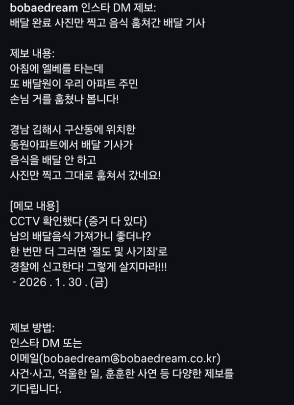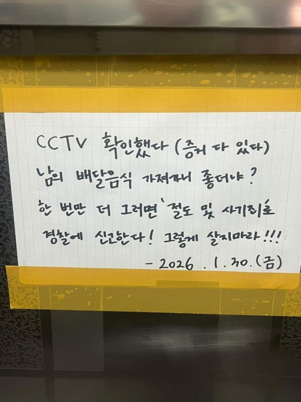 배달 음식 훔친 배달기사에게 경고문