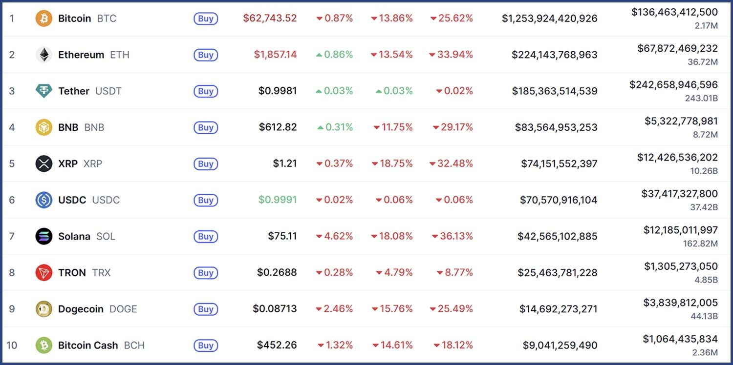 시가총액 1위 비트코인은 6만2743달러에 거래됐다. 비트코인은 24시간 전 대비 13.86% 하락했고, 일주일 전과 비교하면 25.62% 급락했다. 단기 반등 시도는 이어지고 있으나 매도 물량이 출회되며 하락 흐름을 벗어나지 못하는 모습이다.