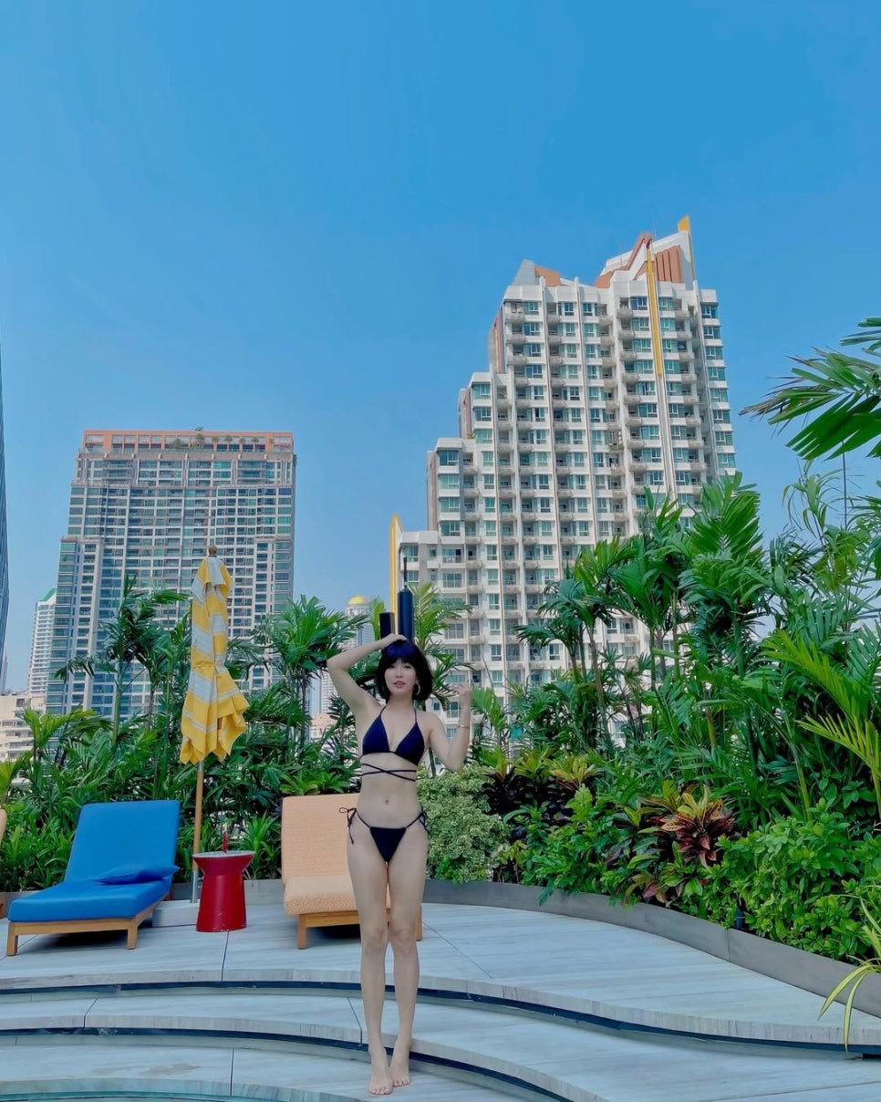 리조트 풀장 옆 카바나에서 무릎을 꿇은 채 촬영한 포즈가 인상적이었다.