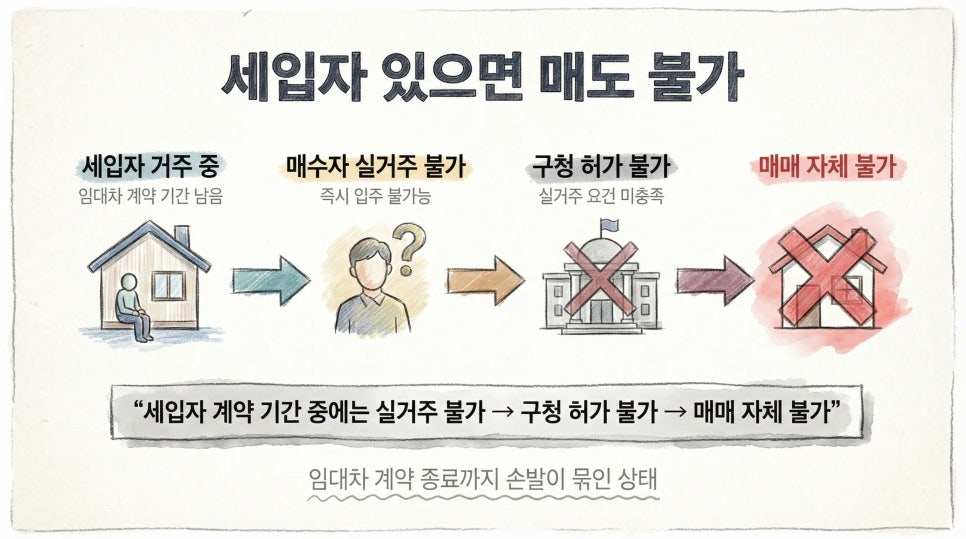 "세입자 계약 기간 중에는 실거주 불가 → 구청 허가 불가 → 매매 자체 불가"