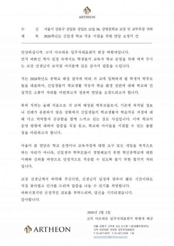 고덕 아르테온 입주민 대표가 학교장 면담 요청 공문 보냄