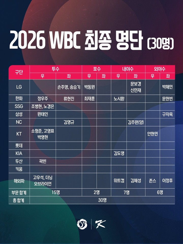 이번 대표팀 선수단은 오는 3월 일본 도쿄에서 개최되는 2026 WBC 무대에 나설 예정이며, 구체적인 명단은 다음과 같다.