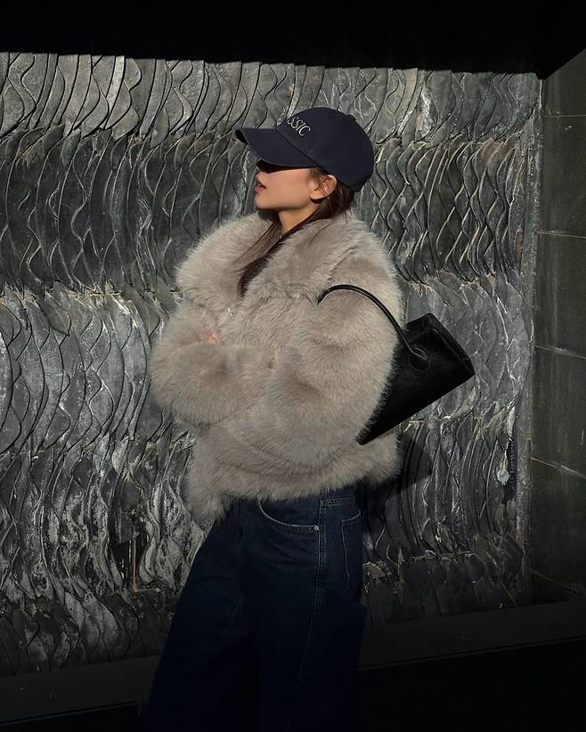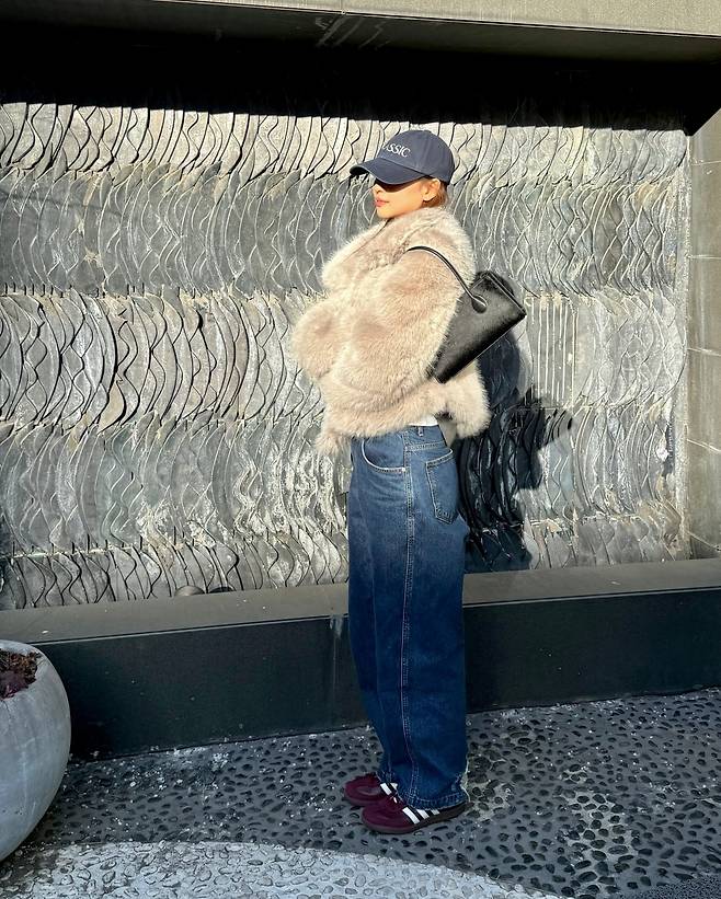 와이드한 핏의 다크 데님 팬츠를 매치해 자칫 무거워 보일 수 있는 퍼 스타일링에 경쾌한 스트릿 감성을 불어넣었는데요.