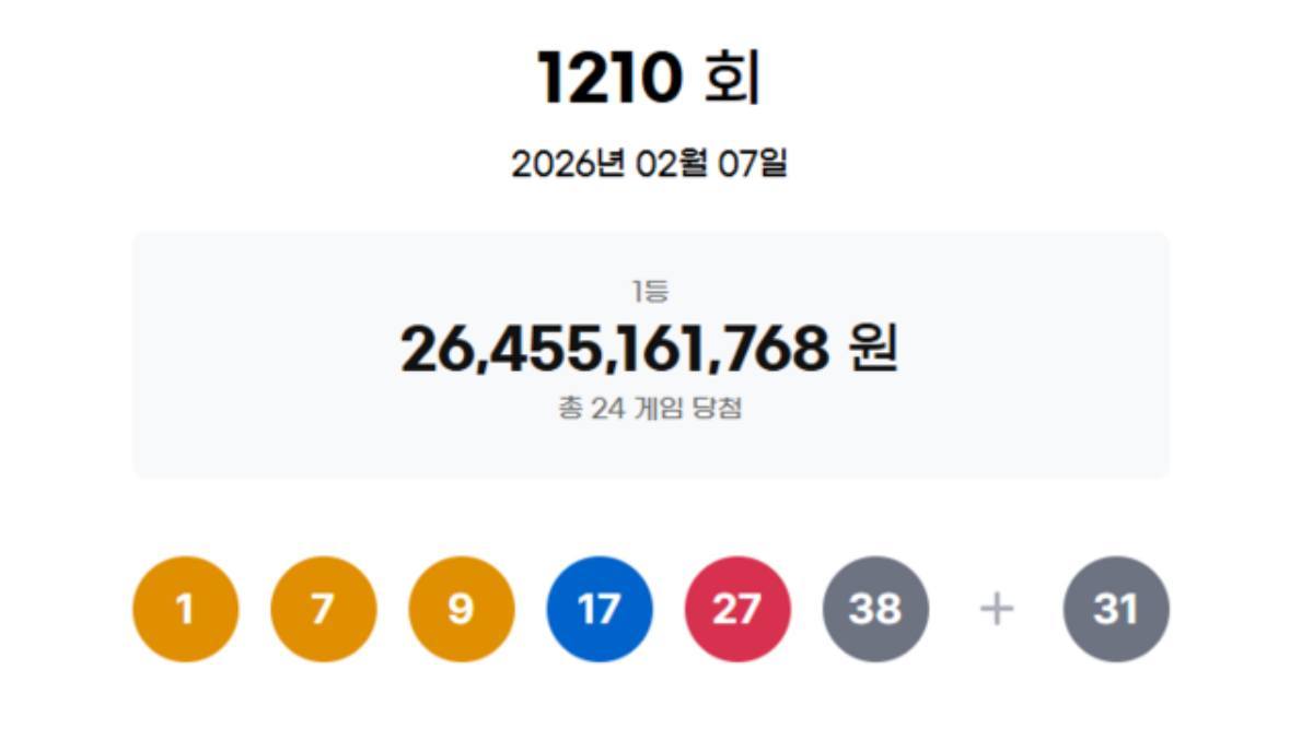 7일 진행된 제1210회 로또복권 추첨에서 1등 당첨 번호는 '1, 7, 9, 17, 27, 38'로 확정됐다. 2등 보너스 번호는 '31'이다.