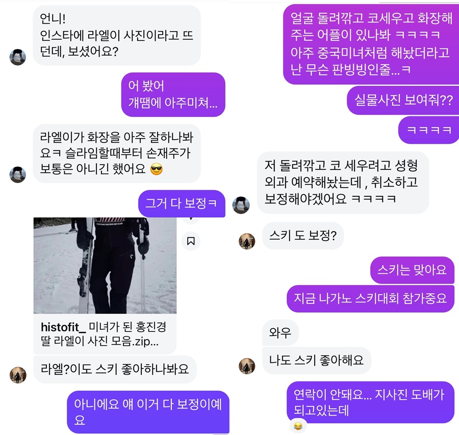 홍진경 역시 이를 접한 듯 지인과 "걔 때문에 아주 미쳐"라며 "그거 다 보정이다. 얼굴 깎고 코 세우고 화장해주는 어플이 있나봐 나는 무슨 판빙빙인 줄...실물 사진 보여줘?"라며 메시지를 주고 받은 내용을 공개했다.