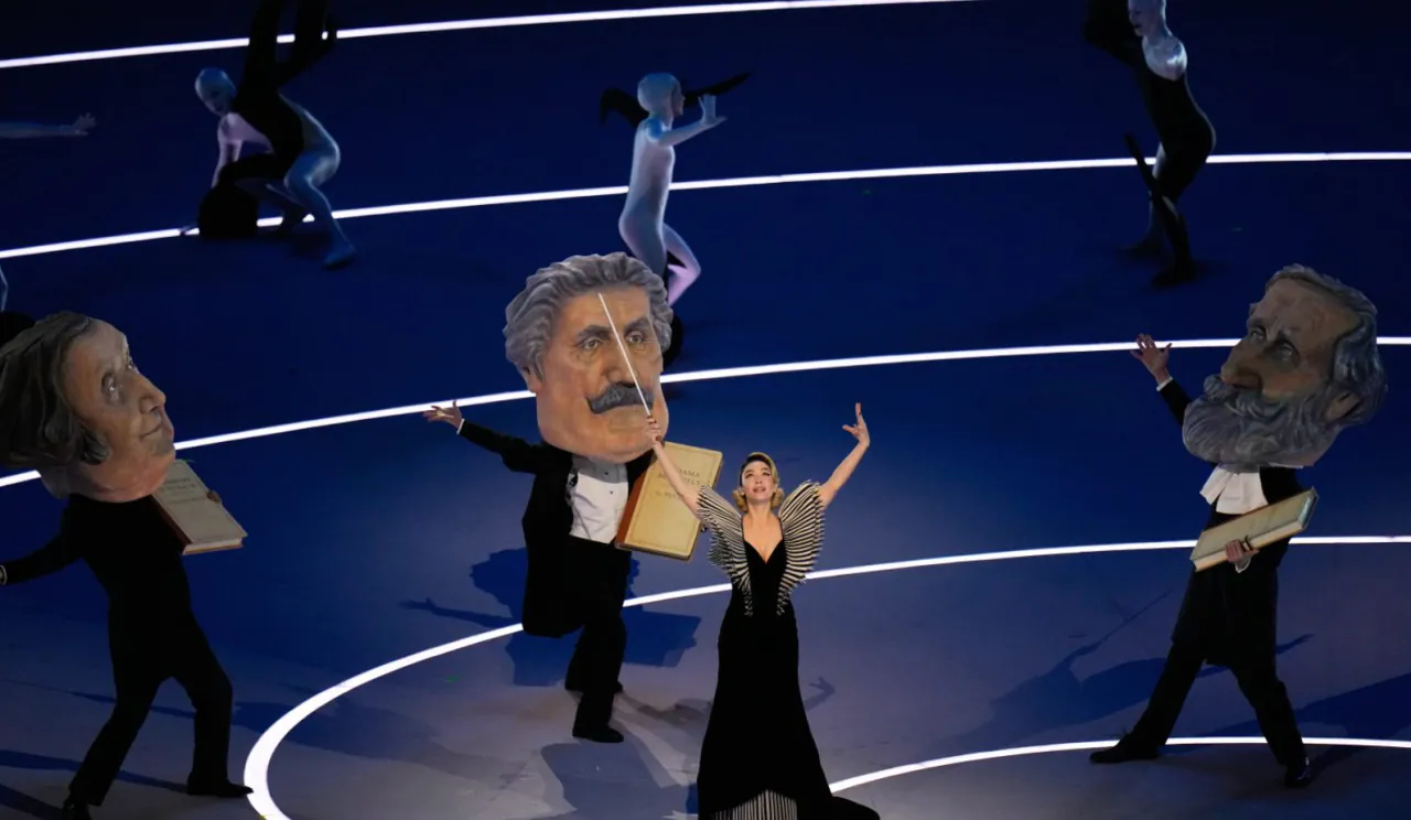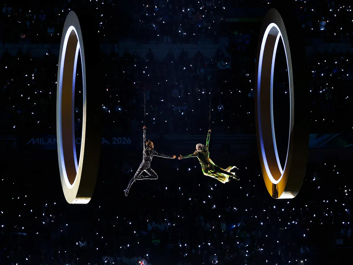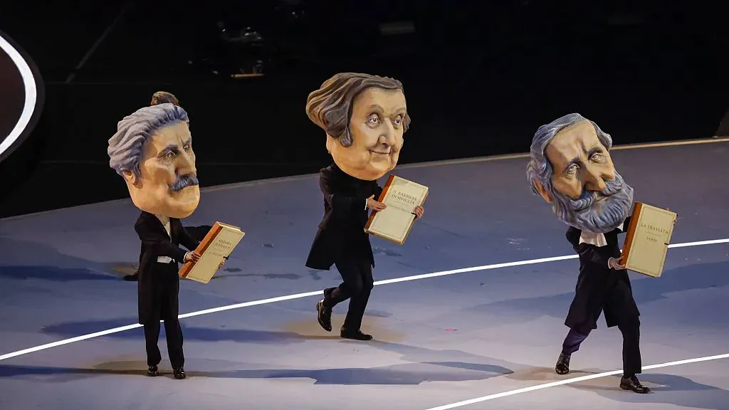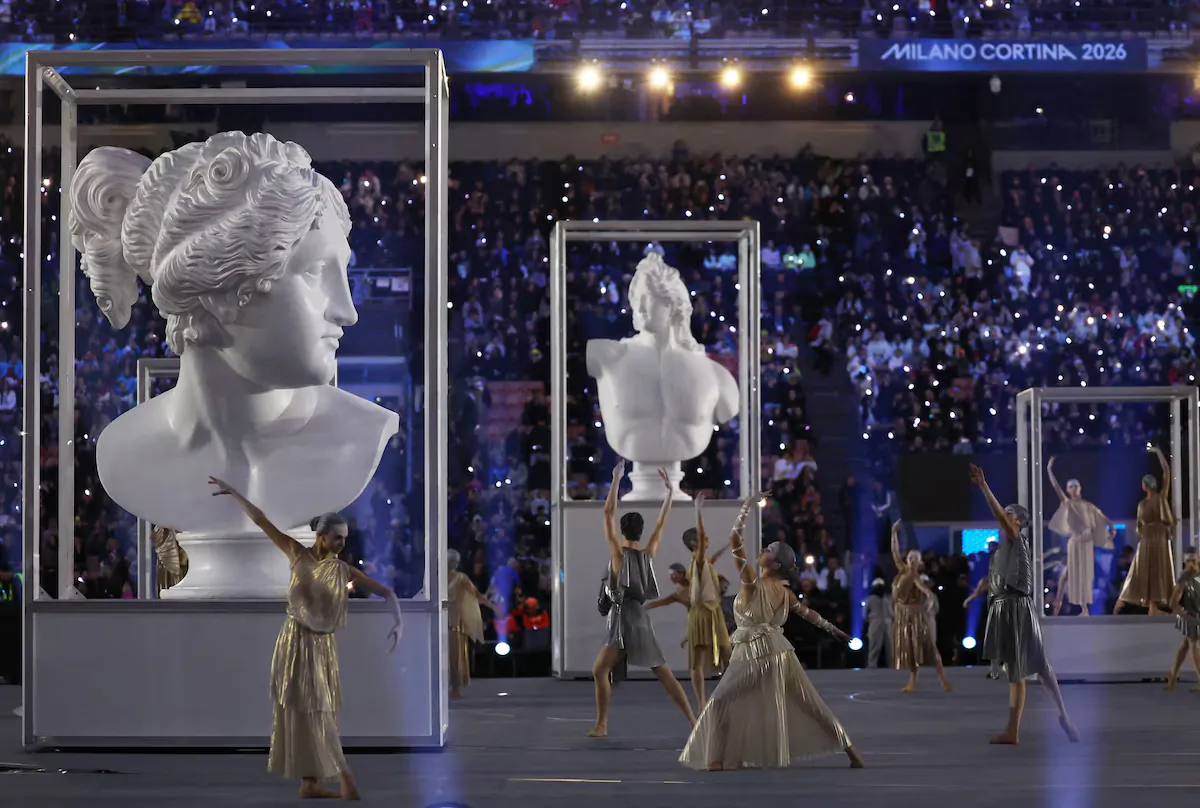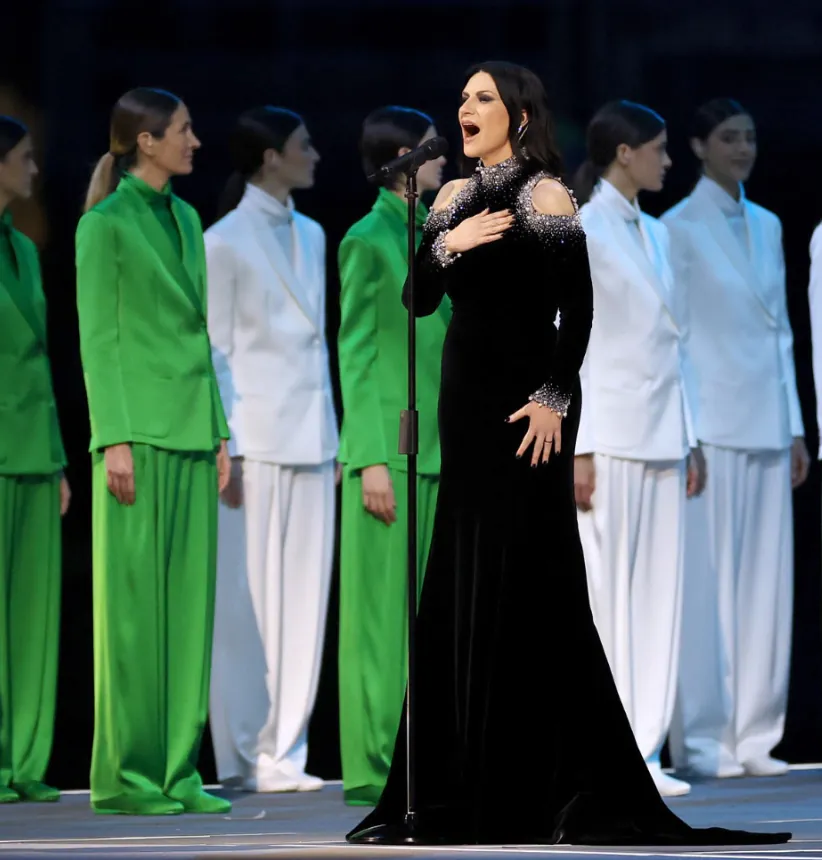 도시와 산을 은유하는 무용수들이 무대에 들어선다이탈리아에는 수많은 손동작 제스쳐들이 있는데, 배우 브렌다 로디자니가 방송사고를 가장해 이를 재치 있게 설명한다경기장으로 두 성화 봉송 주자가 들어온다월드컵 우승 멤버이자 양 밀란의 레전드 주세페 베르고미와 프랑코 바레시