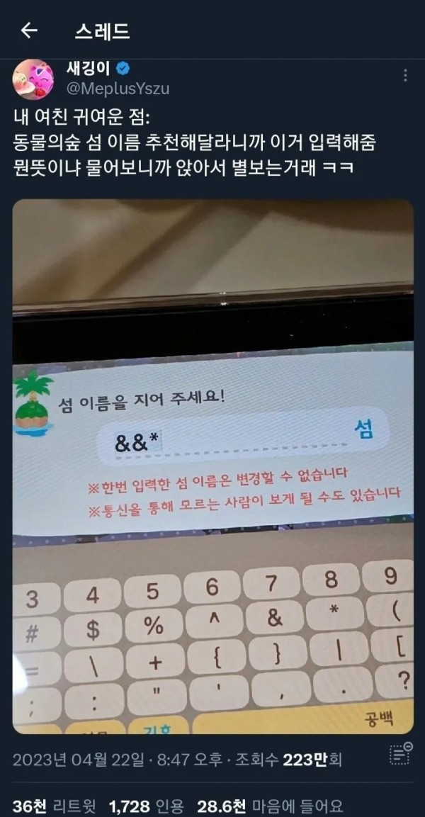 동물의 숲 섬 이름 지어준 여친의 센스