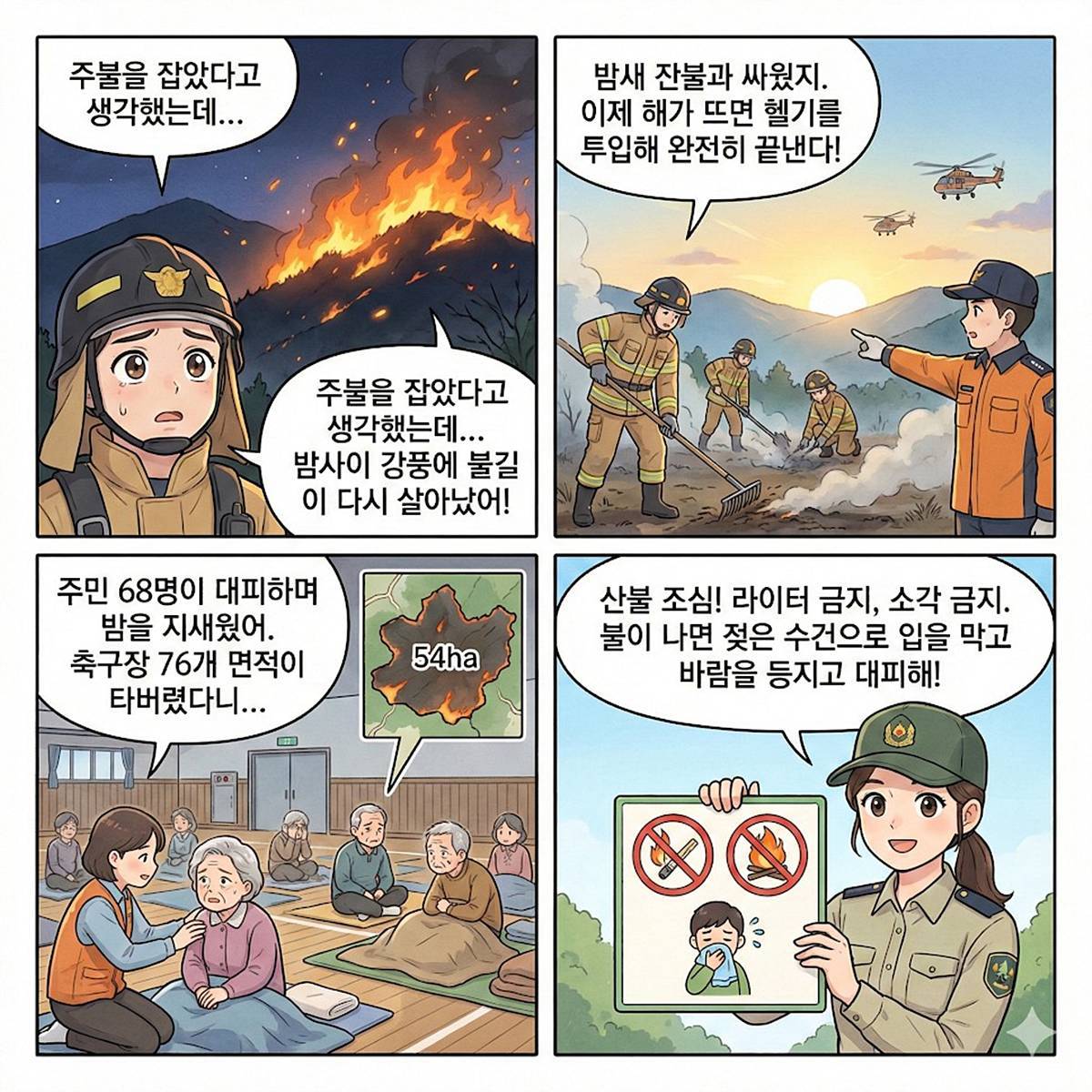 차량으로 대피할 땐 도로 정체나 연기 고립 위험이 있어 지자체·소방 안내가 있을 때만 이용하는 게 좋다. 대피소(마을회관·경로당 등)로 이동할 때는 숲에서 떨어진 넓은 공터나 도로변을 우선 선택하고, 밤에는 잔불이 다시 번질 수 있는 만큼 안내가 있을 때까지 대피 장소에 머문다. 가족과 이웃의 위치를 확인하고, 노약자·어린이 동행을 먼저 챙기는 것도 잊지 말아야 한다.
