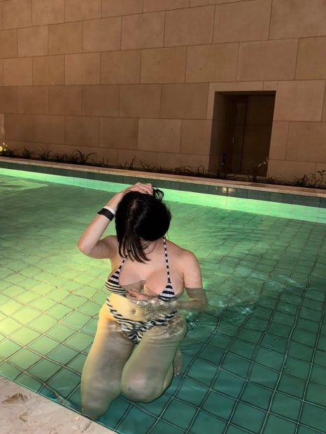 저녁에는 실내 풀에서 스트라이프 비키니로 분위기 전환을 했어요.