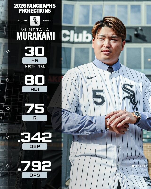 9일(현지시간) 메이저리그(MLB) 공식 SNS는 통계 사이트 팬그래프의 2026시즌 무라카미 무네타카 예상 성적을 공개했다. 이 전망에 따르면 무라카미는 시카고 화이트삭스 유니폼을 입고 136경기에 출전, 타율 0.232, 30홈런, 80타점, OPS 0.792를 기록할 것으로 예측됐다.