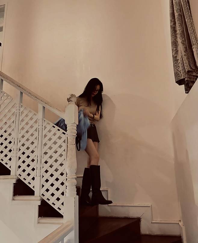 무릎까지 올라오는 블랙 롱부츠를 착용해서 다리 라인을 더욱 길어 보이게 연출했고, 심플한 블랙 숄더백으로 전체적인 컬러 밸런스를 차분하게 잡아줬어요.
