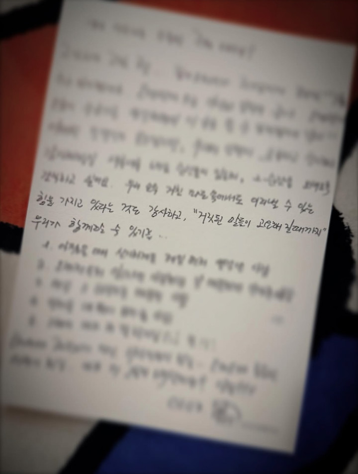 이와 함께, 한 팬이 건넨 편지의 일부를 공개했다. 해당 편지는 "'거짓된 말들이 고요해질 때까지' 우리가 함께할 수 있기를"이라는 내용을 담고 있어, 최근 불거진 논란과 맞물려 다양한 해석을 이끌어냈다.