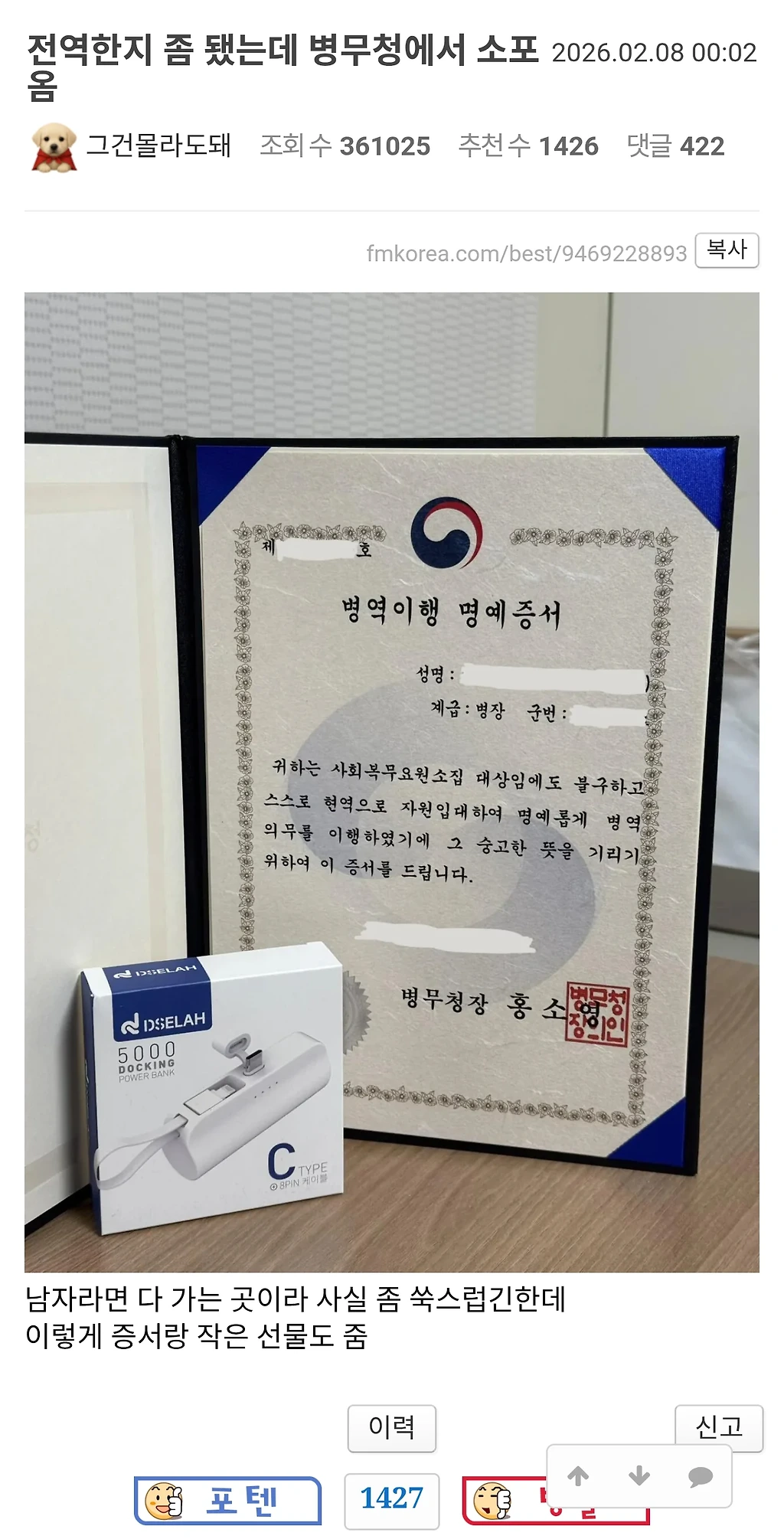 전역한지 좀 됐는데 병무청에서 소포 받은 사람
