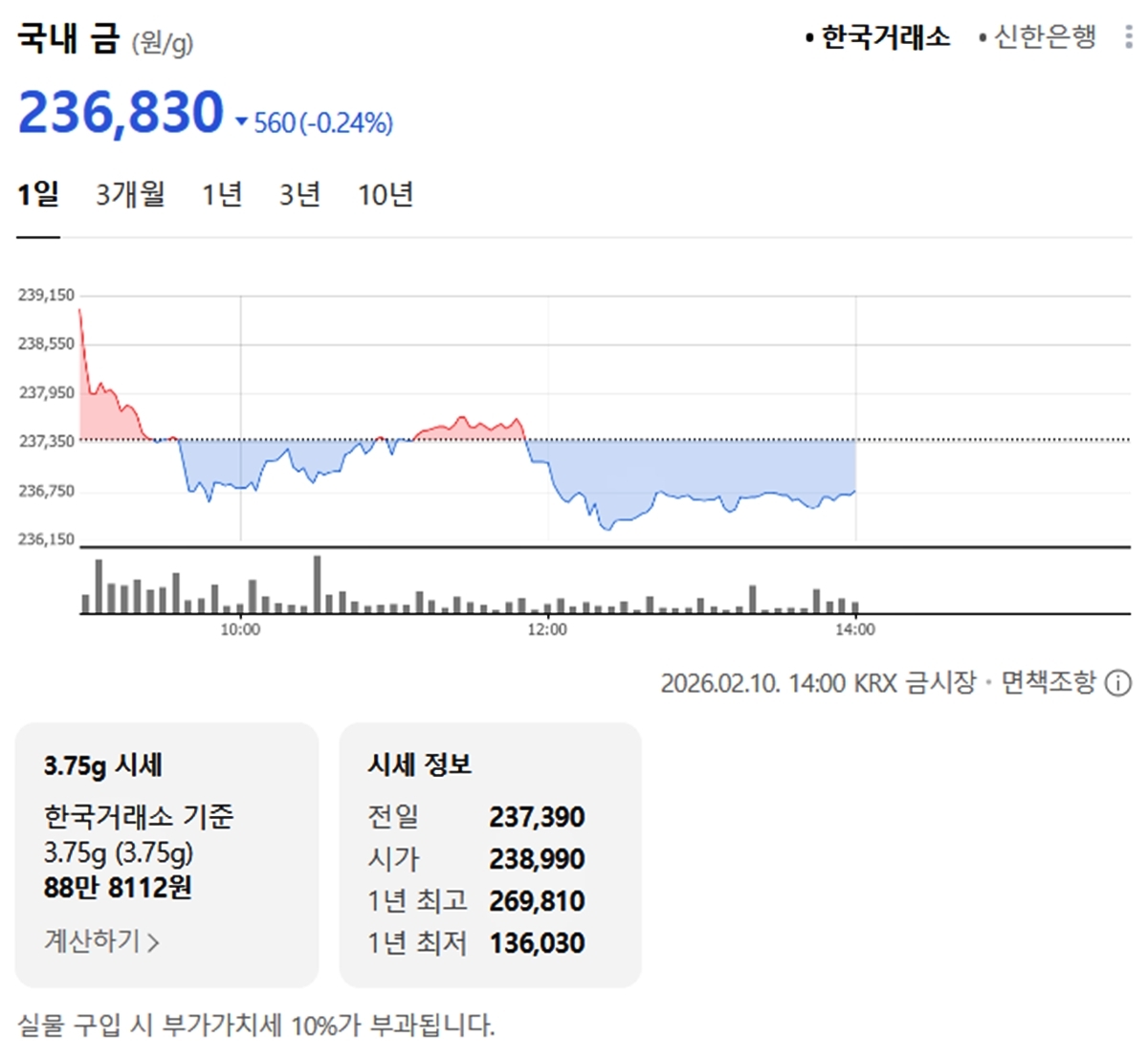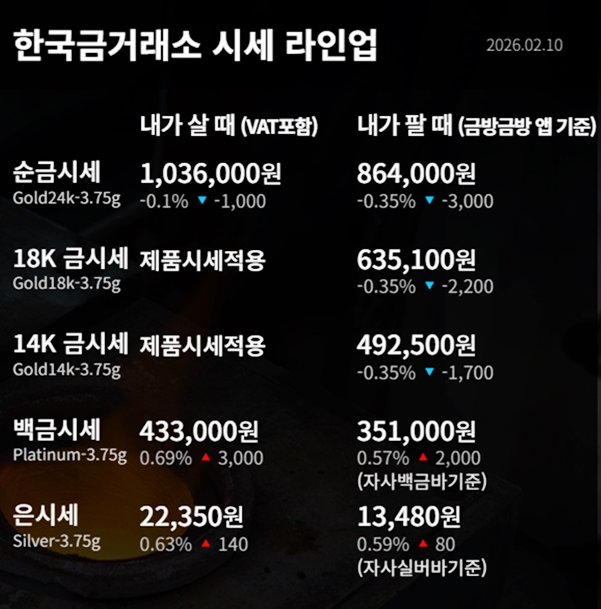 국내 금시세(금값)가 10일(이하 한국 시각) 오후 하락세(전 거래일 대비)로 마감했다.