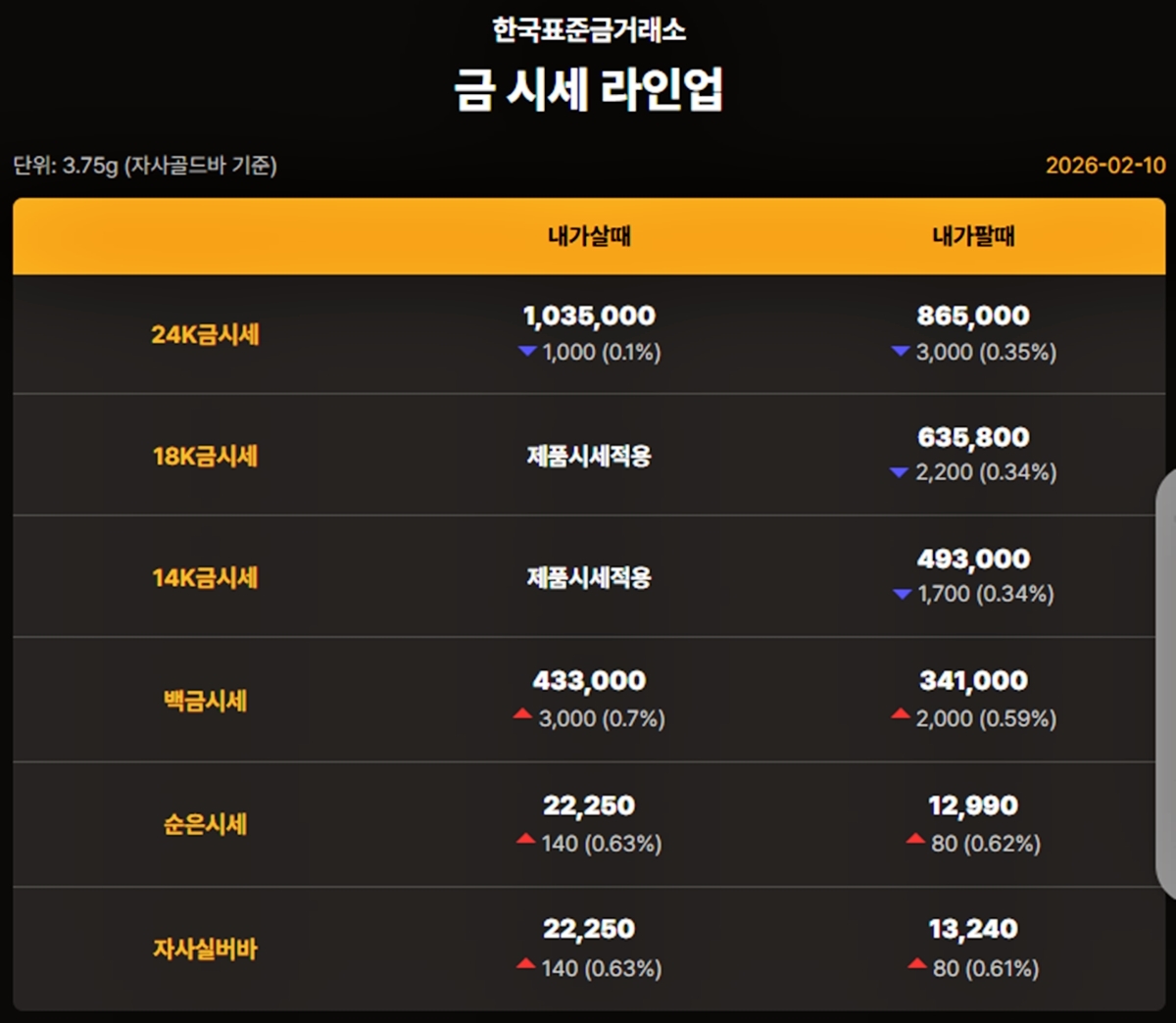 대한민국 자본시장을 종합적으로 관장하는 한국거래소 기준 이날 오후 금가격은 다음과 같다.