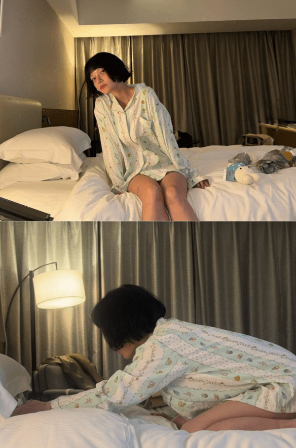 AOA 지민, 잠옷 단추 푼 채...침대 위 뭘 찍는거야?