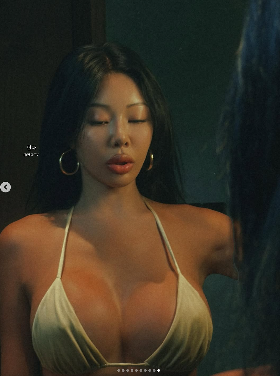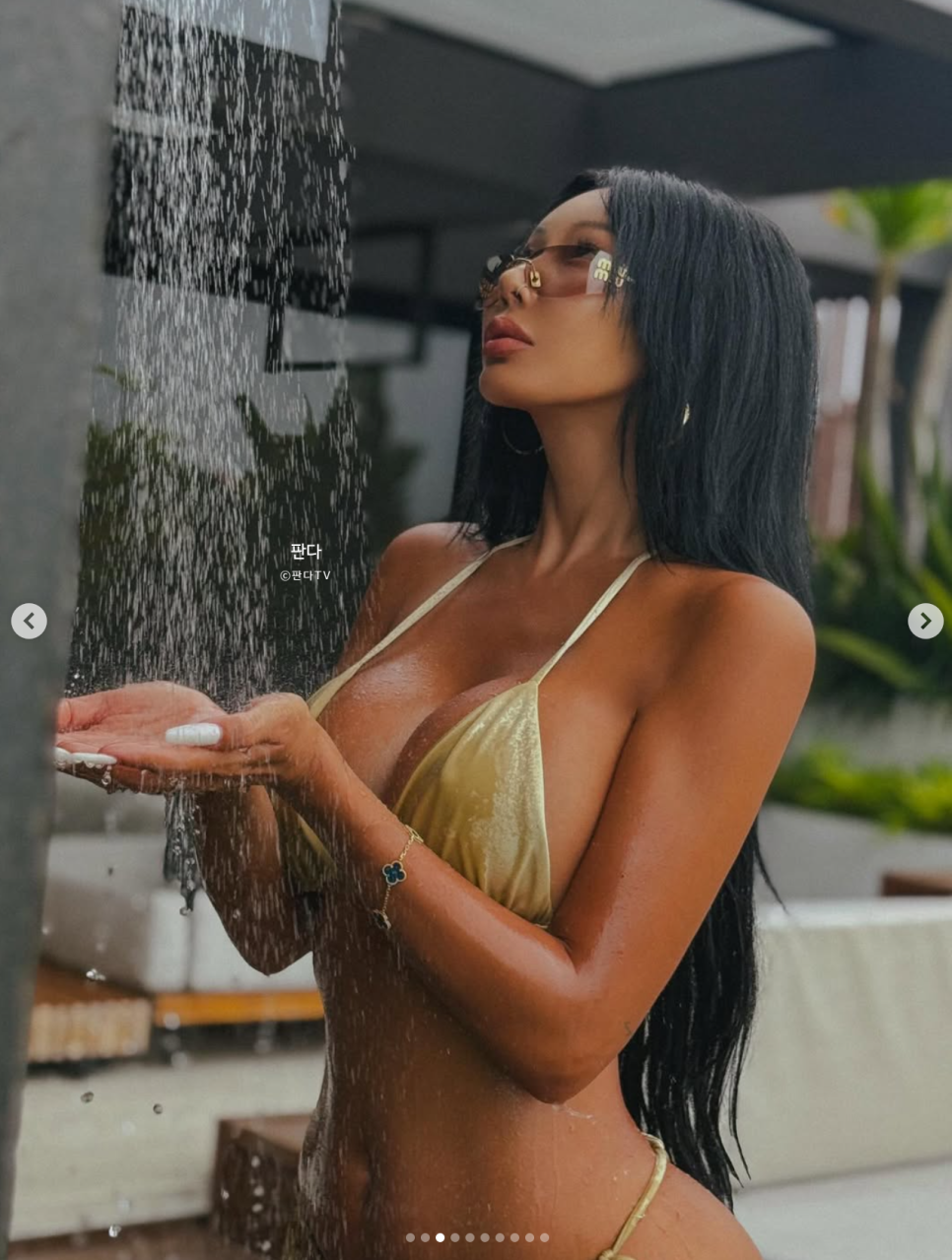 골드 톤 비키니를 입고 눈을 지그시 감은 채 서 있는 모습은 마치 할리우드 영화의 한 장면 같은 착각을 불러일으키죠.