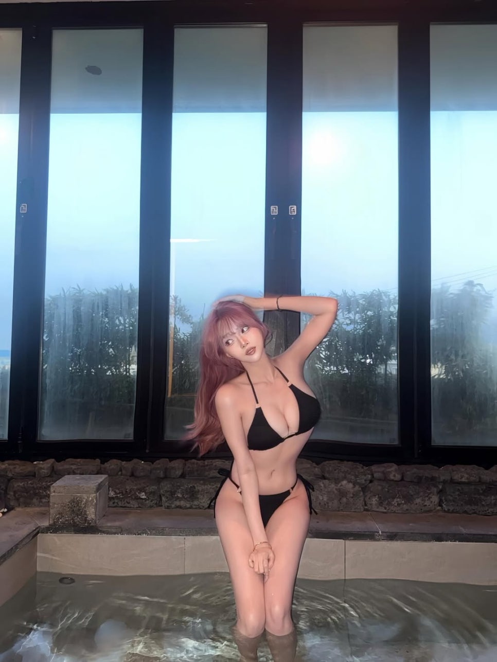 차분한 애쉬 핑크 헤어와 대비되는 블랙 비키니 조합이 몽환적이면서도 고급스럽죠.
