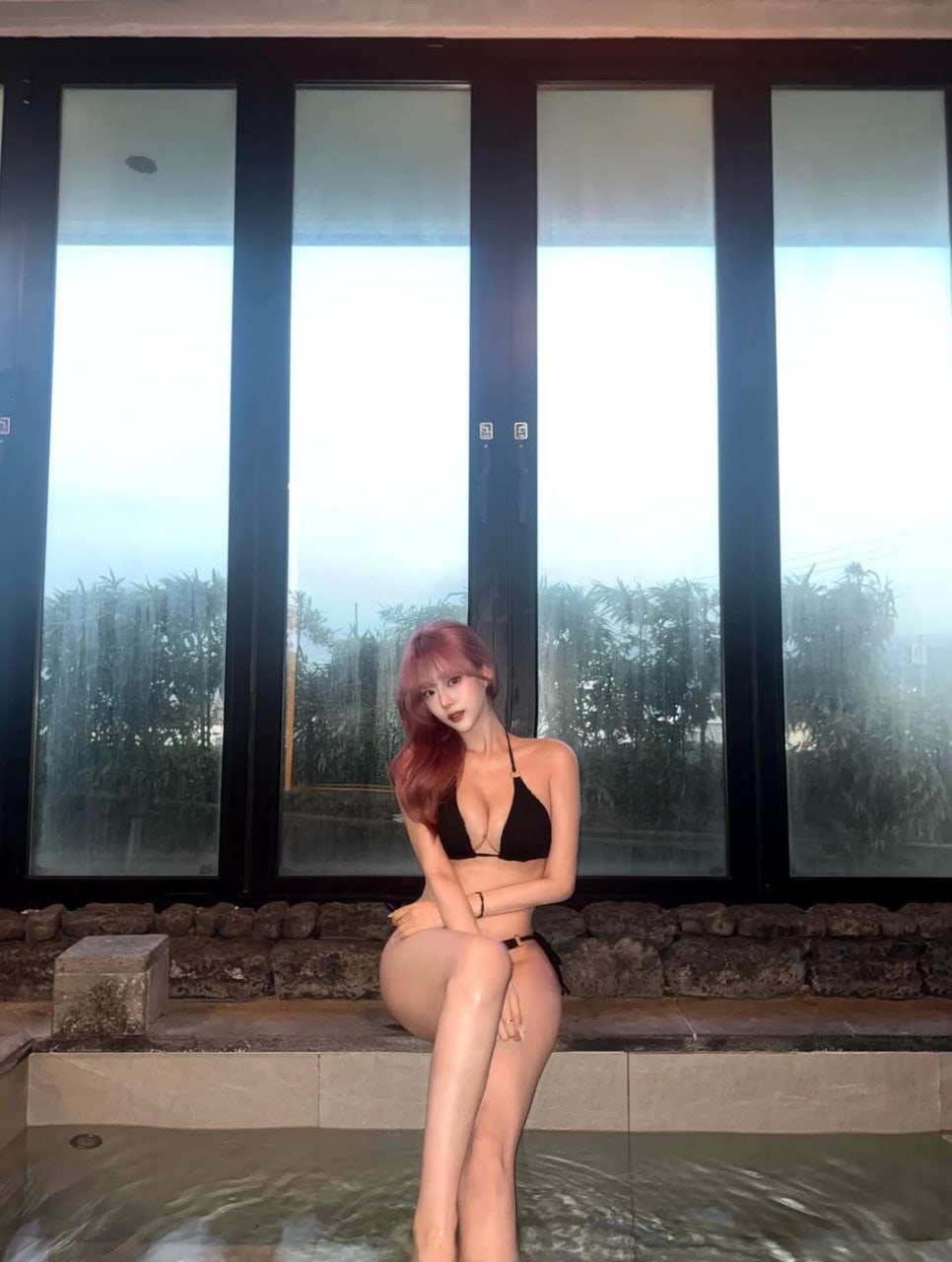 애쉬 핑크 헤어 + 블랙 니트 비키니 + 투명 메이크업 + 스파 배경 = 몽환적 무드 완성이에요.