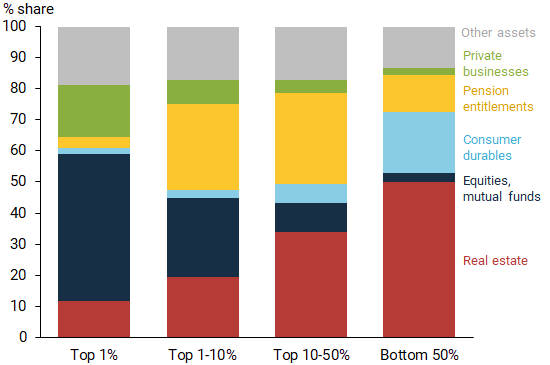 즉 미국인 90% 가 가진 자산은 압도적으로 자가 즉 부동산임. 그럼 그 거대한 미국 주식은 누가 갖고 있냐고?상위 1% 가 절반 그리고 나머지 상위 2~9% 가 37%, 거의 40% 를 갖고 있고 하위 50% 는 1% 남짓. 다시 말해 기껏해야 용돈 수준이란거고 미국 서민들에게 주식 호황등은 다른나라 얘기란거.