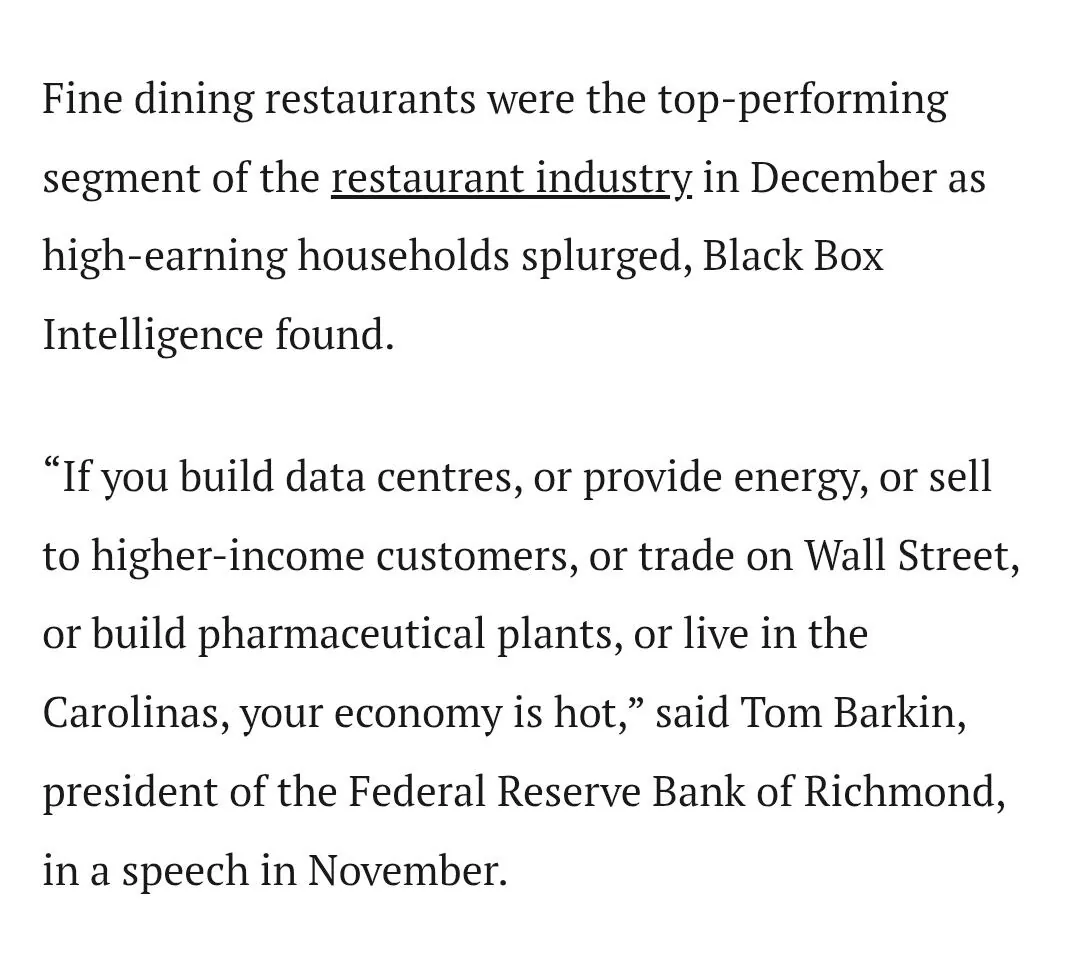 [ 월스트리트나 데이터센터 관련이면 돈을 매우 잘 벌지만, 농부나 공장 노동자들은 큰 피해를 본다는 리치몬드 연준 의장 ]