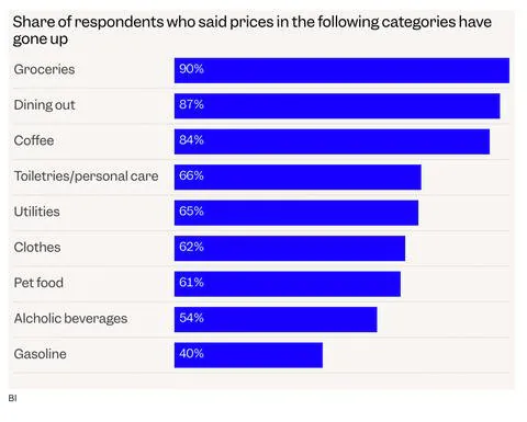 미국인들이 가격이 가장 많이 올랐다고 체감하는것들은 화려한 사치재들이 아님. 식료품, 외식, 커피등 일상적인 소비재들이지.즉 미국 경제 성장률이 높게 찍히는것과 달리 미국의 일반적인
