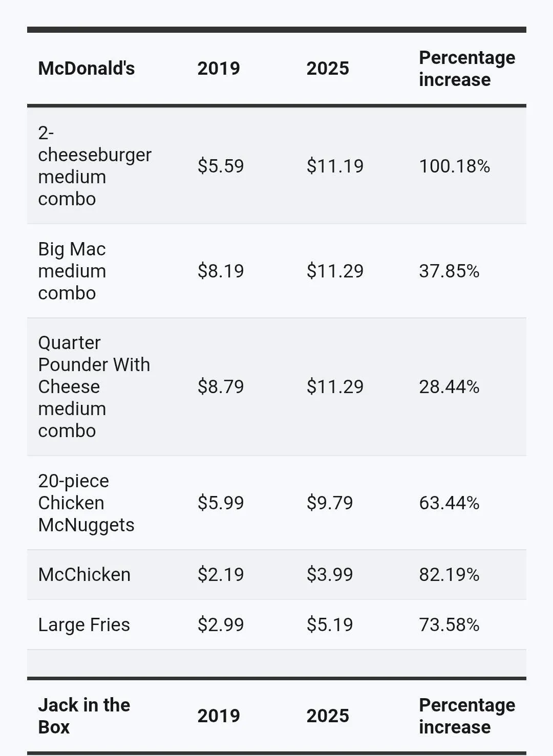 한 예시로 2019년도까지만 하더라도 빅맥 세트 가격은 약 8달러 즉 한국돈으로 치자면 11000원 정도. 그러나 2025년에 오면 이는 11달러 16000원 이상으로 증가.