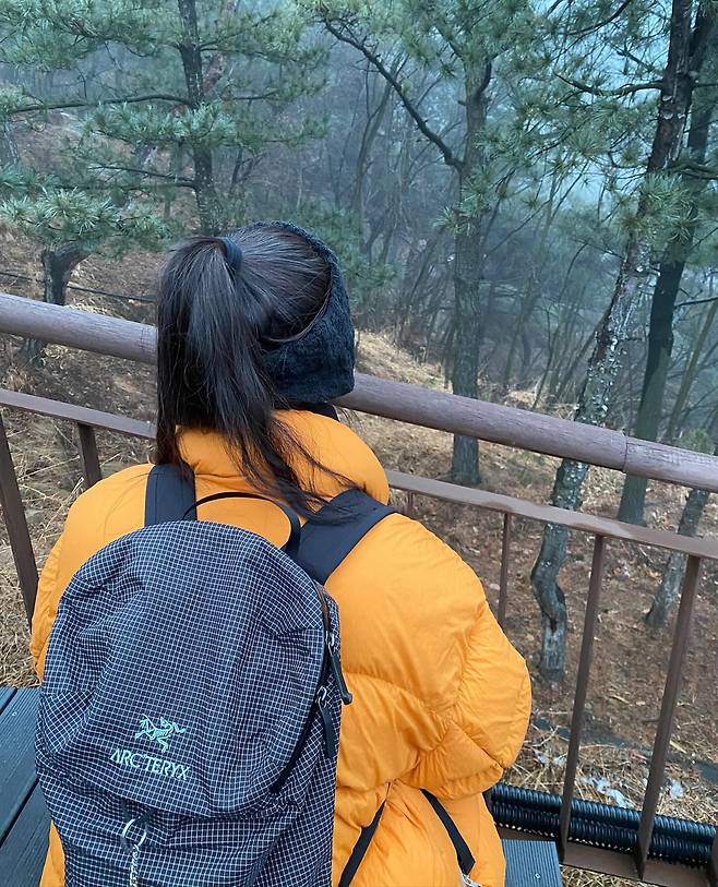 안개가 자욱한 겨울 산을 배경으로 한승연은 활동적이면서도 따뜻한 등산 패션을 선보였어요.