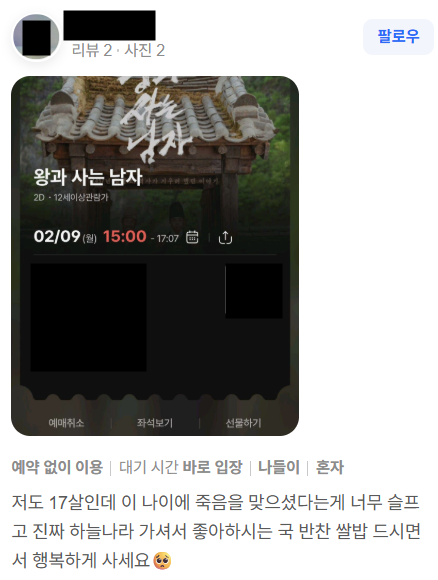 [EPN엔피나우 고나리 기자] 영화 ‘왕과 사는 남자’가 박스오피스에서 흥행을 이어가는 가운데, 관객들의 반응이 온라인 리뷰로 번지고 있다.