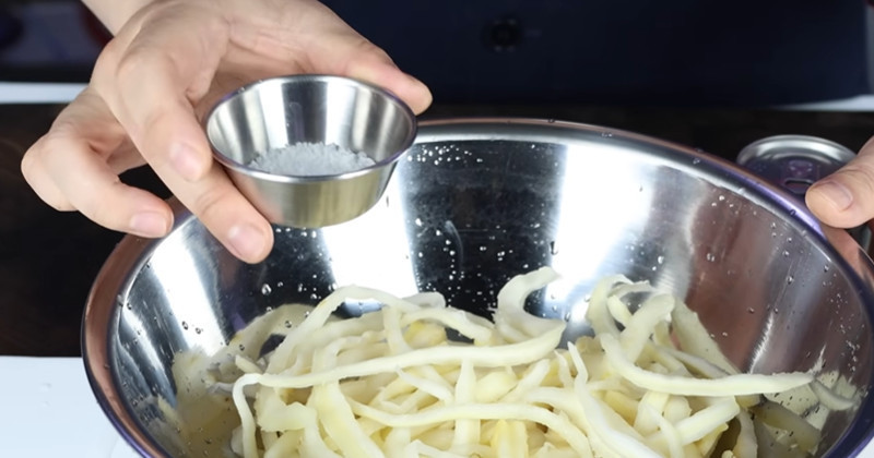 재워둔 도라지는 체에 밭쳐 물기를 뺀 뒤 가볍게 헹궈준다. 배 음료의 단맛이 과하게 남지 않도록 하는 과정이다. 이후 끓는 물에 소금을 약간 넣고 1분 남짓 데친다. 너무 오래 삶으면 질겨질 수 있으니 숨이 죽을 정도만 익히는 것이 중요하다. 데친 뒤에는 찬물에 헹궈 물기를 꼭 짠다.