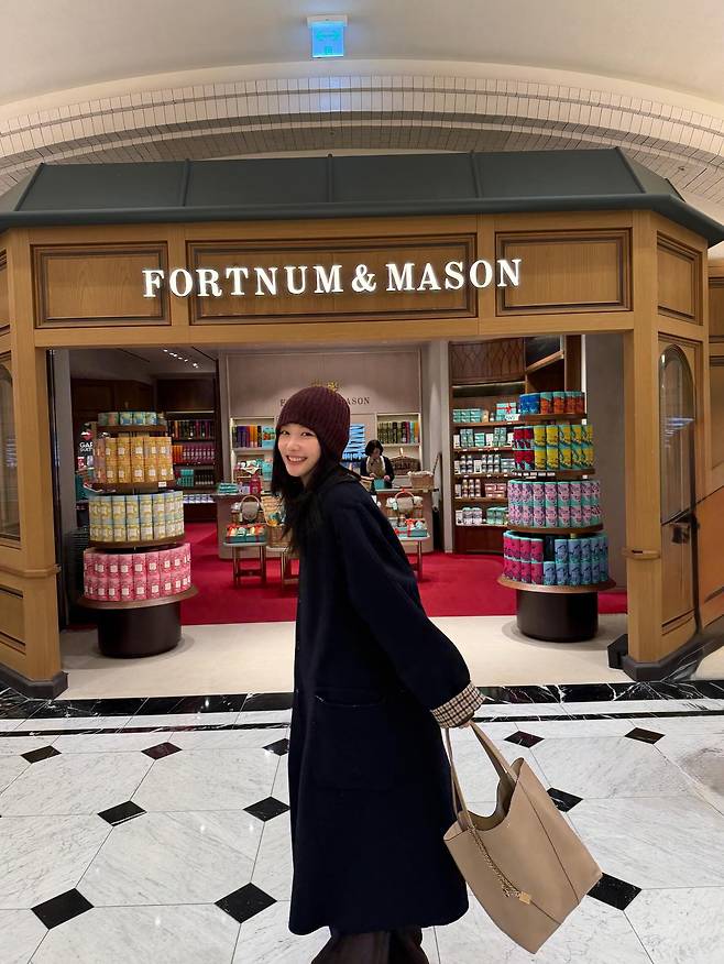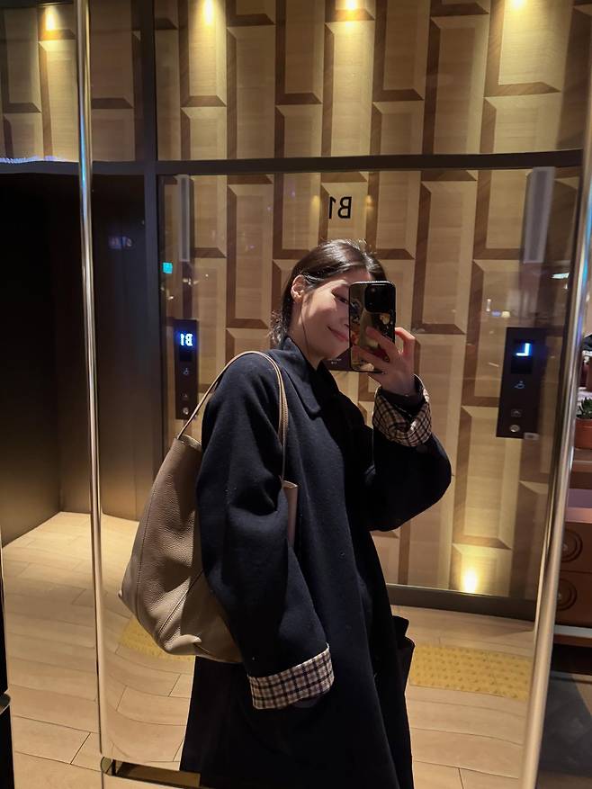 어깨에 가볍게 걸친 베이지 톤의 토트백은 전체적인 어두운 착장에 부드러운 화사함을 불어넣으며 세련된 컬러 밸런스를 맞춰주는 역할을 하고요.