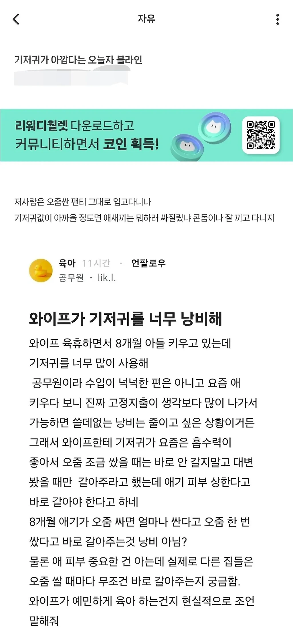 와이프가 기저귀를 낭비한다는 오늘자 블라인 - 와이프 육휴, 본인 공무원 - 지출이 크니 낭비 줄이길 원함 - 애기 기저귀 오줌 싼걸로는 갈지말고 똥 싸면 갈아줘 시전 기저귀랑 분유는 아끼는거 아니랬는데; 죽었다가 부활한 극장 이야기고대 한국이 미친놈들인 이유심각해 보이는 전주 송천동 들개무리들배우자 선호 종교 1위 기독교보이는 그대로를 믿으면 안되는 이유