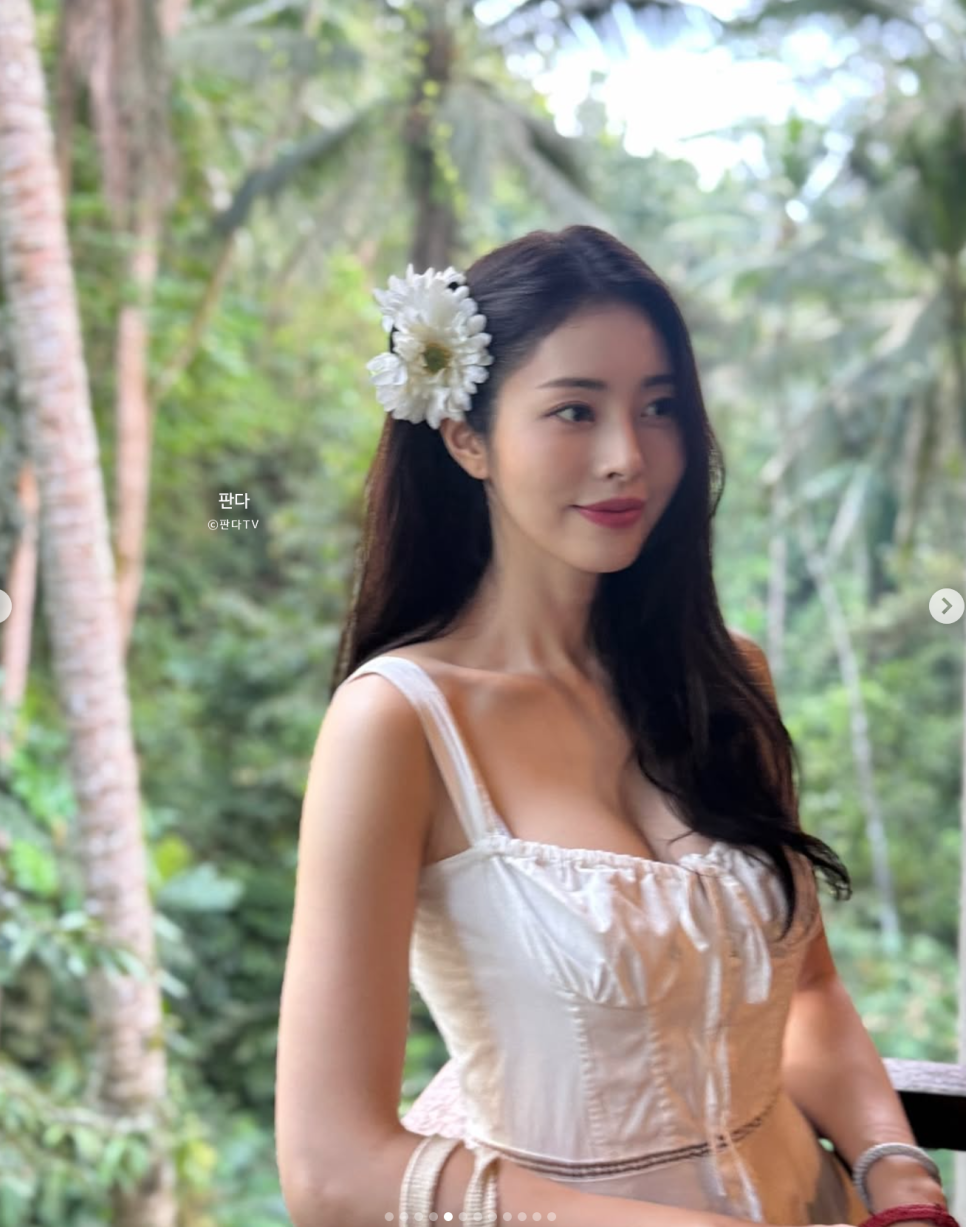 발리 신혼여행지에서 선보인 연보라와 연두빛이 어우러진 플라워 패턴 스타일은 이국적인 휴양지 분위기를 극대화하는 신의 한 수였죠.