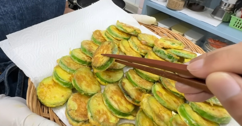 애호박전을 뒤집는 횟수도 최소화한다. 한 면이 충분히 익은 뒤 한 번만 뒤집는 것이 좋다. 여러 번 뒤집으면 수분이 빠져나가 식감이 단단해진다. 익은 뒤에는 키친타월 위에 올려 기름을 빼준다. 이 과정까지 거치면 식어도 퍽퍽하지 않다.