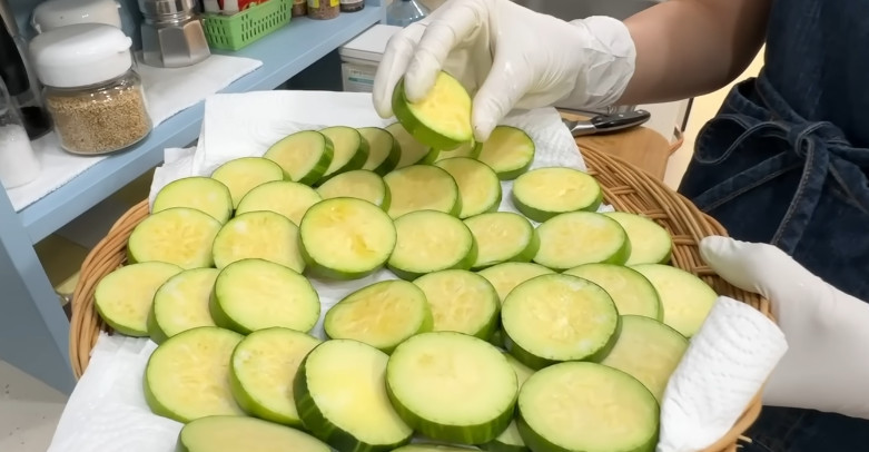 냉장 숙성을 마친 애호박은 따로 물에 헹구지 않는다. 키친타월로 겉면의 물기만 가볍게 눌러 제거한다. 이미 소금으로 밑작업이 되어 있기 때문에 추가 간은 거의 필요 없다. 이 상태에서 바로 부침을 준비하면 된다.