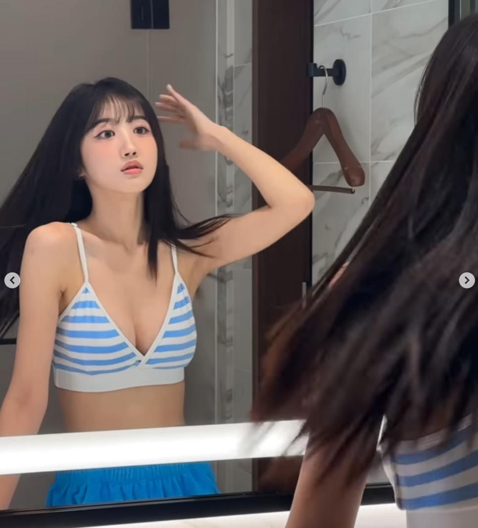 수영복 특유의 노출보다는 깨끗하고 청량한 분위기를 강조해, 마치 휴양지에서 여유를 즐기는 영화 속 주인공 같은 느낌을 주었습니다.