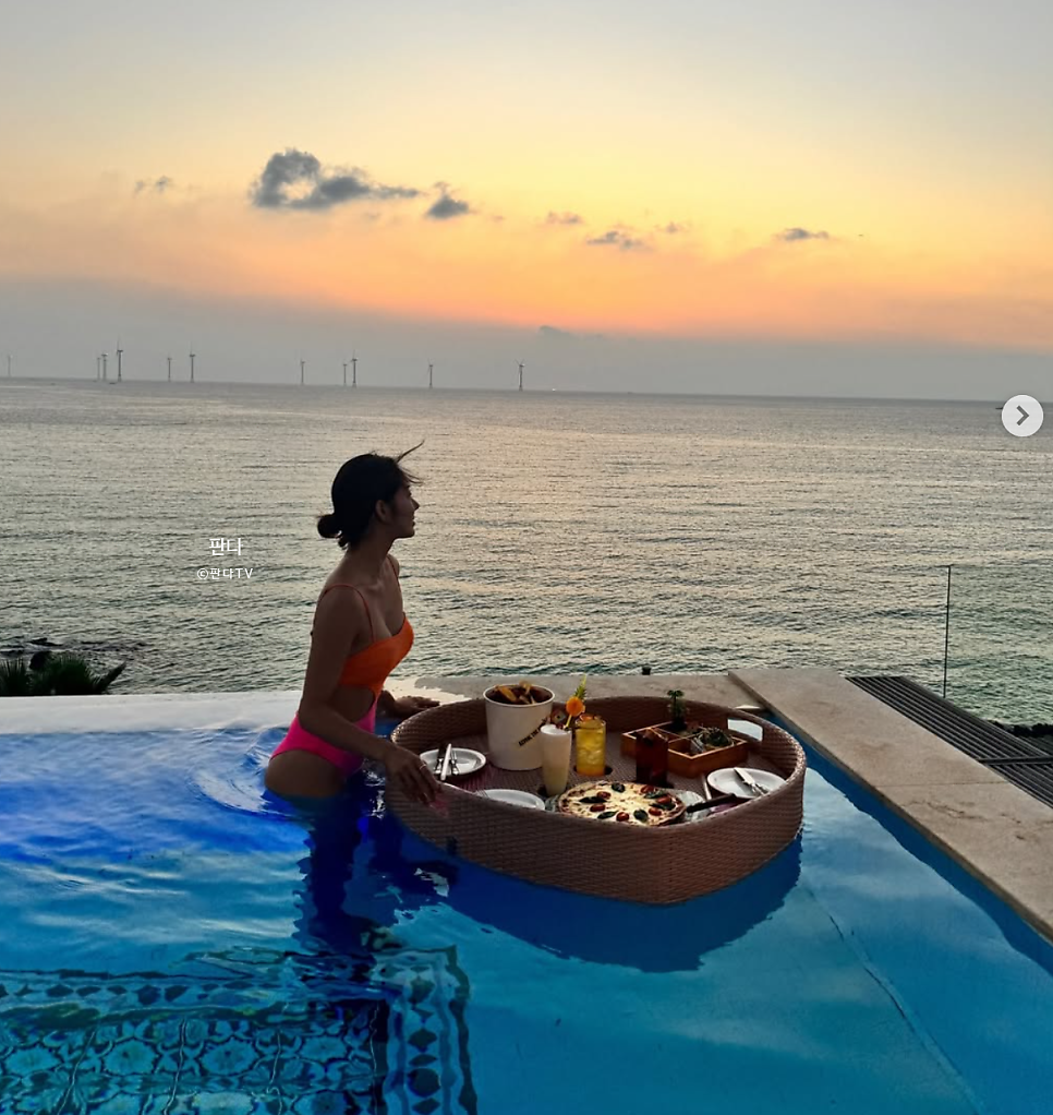 석양 아래서 더욱 돋보이는 형광색 수영복이나 독특한 패턴의 비치웨어는 한때 여성들의 워너비였던 그녀의 감각을 다시금 각인시켰습니다.
