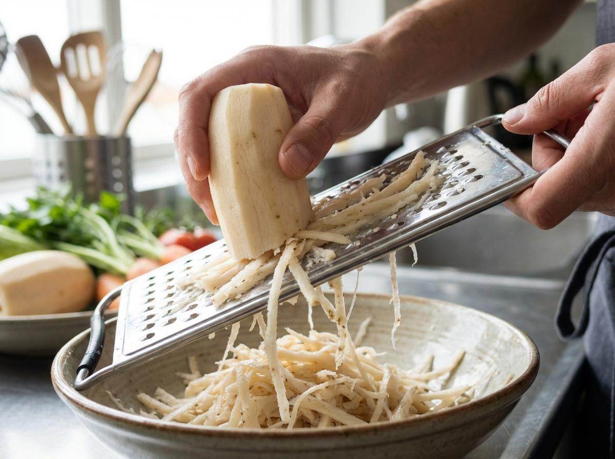 조리의 출발점은 연근 손질이다. 연근 1kg의 껍질을 벗긴 뒤 믹서가 아닌 강판에 곱게 간다. 믹서를 사용하면 입자가 지나치게 곱게 갈려 질감이 무너질 수 있기 때문에, 강판을 이용해 섬유질을 살리는 것이 중요하다. 이 과정이 완성된 전의 아삭함을 좌우한다.