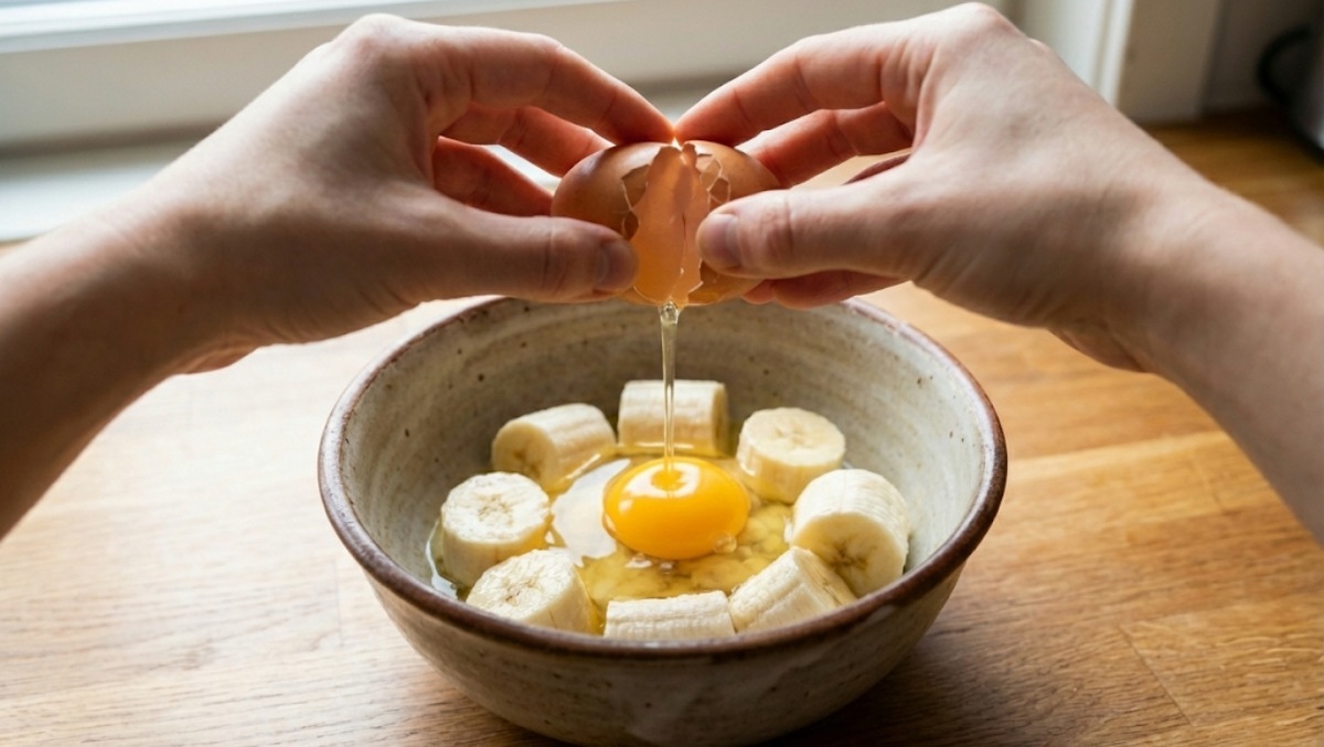 유튜브 '퇴근후살림'에 따르면, 먼저 빈 그릇에 바나나 1-2개와 계란 1-2개를 넣는다. 이후 포크로 바나나와 계란을 마구 으깨준다.