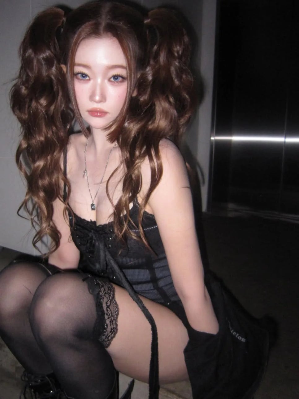 블랙 코르셋 + 가터벨트 + 캣츠아이 메이크업 + 하이 트윈테일 = 다크 키치 완성이에요.