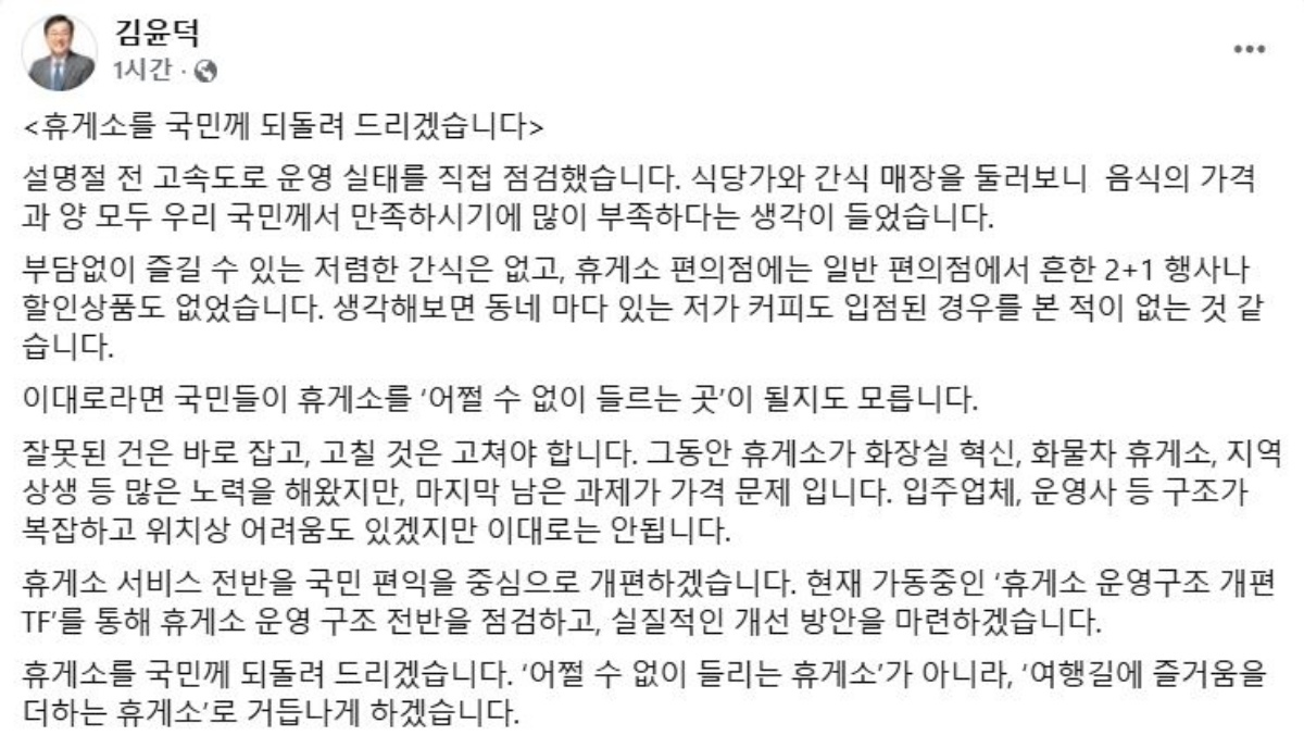 휴게소 가격 구조에 대한 문제의식도 함께 언급했다. 김 장관은 “이대로라면 국민들이 휴게소를 ‘어쩔 수 없이 들르는 곳’이 될지도 모른다”고 적었다. 이어 “잘못된 것은 바로잡고 고칠 것은 고쳐야 한다”고 강조했다.