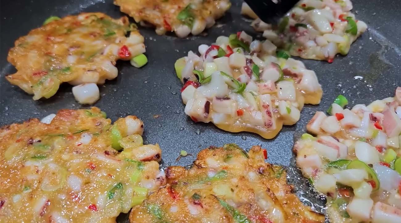 손질한 오징어에는 밑간을 과하게 하지 않는다. 소금과 후추를 아주 약하게 뿌려 재료 본연의 맛을 살리는 쪽이 한국식 전 조리의 기본이다. 이후 밀가루를 얇게 묻혀 표면을 코팅하고 풀어둔 달걀물에 담갔다가 달군 팬에 올린다. 기름은 팬 바닥을 얇게 덮을 정도로 두르고 중불에서 천천히 부친다. 겉면이 황금빛으로 변하면 뒤집어 반대쪽도 익힌다. 오징어는 오래 익히면 질겨지기 때문에 과도한 가열을 피하는 것이 관건이다. 겉은 부드럽게 감싸고 속은 탱글하게 탄력을 유지하는 지점에서 불을 끈다.