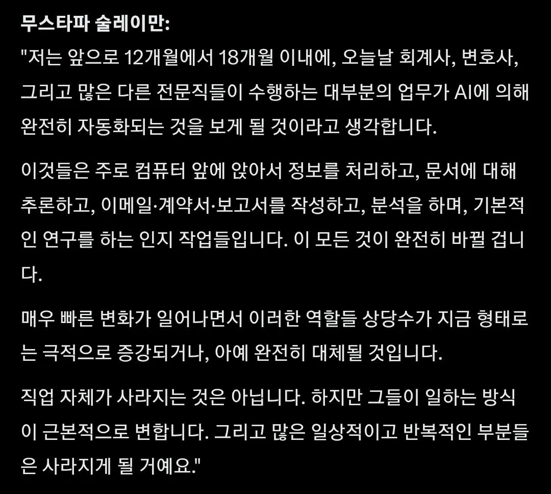 오늘 마이크로소프트 AI CEO가 회계사,변호사 업무는 완전히 바뀔거라고 함 (물론 직업 자체가 없어지는건 아니라고 함) 실제로 최근 글로벌 회계법인 KPMG는 고객들이 " 니네 AI로 비용 절감하면서 마진 챙기는데 그만큼 감사 용역비 낮춰라, 아니면 다른 곳으로 가버린다? " 하면서 압박중 지방 통합 시작되는듯...실시간 삼성전자 하룰라라 가는중정말 서울 비 아파트도 폭등중인걸까? 알아보자전 세계 나라별 가장 흔한 혈액형실제로 보면 어마무시하다는 6.7m 완전체 대동여지도