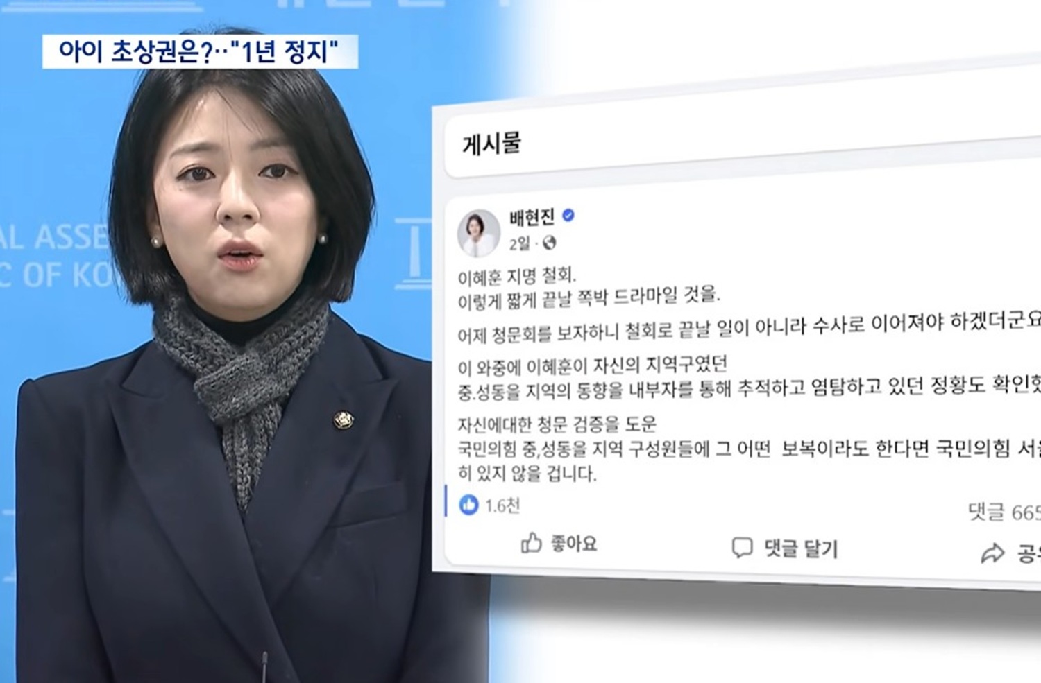 국민의힘 윤리위원회는 SNS에서 자신을 비판한 누리꾼 자녀의 사진을 무단으로 게시한 배현진 의원에게 당원권 정지 1년 처분을 내렸다. 배 의원은 지난달 이해운 기획재산처 장관 후보자 낙마와 관련해 누리꾼과 설전을 벌이던 중, 해당 누리꾼 아이의 사진을 모자이크 없이 댓글에 올렸다. 윤리위는 이를 모욕적이고 협박적인 표현이자 국민 정서에 반하는 명예훼손으로 판단했다.