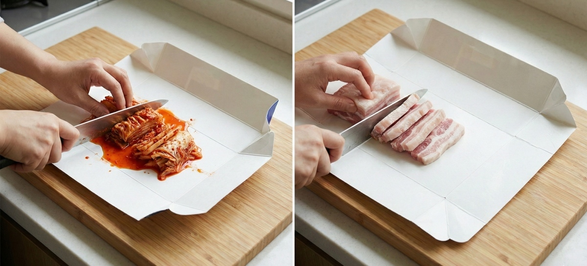 특히 김치처럼 색이 강한 양념 식재료를 다룰 때 유용하다. 고춧가루 양념이 도마에 배어들면 세척해도 붉은 기가 남는 경우가 많다. 이때 도마 위에 우유팩을 펼쳐 한 장 깔고 그 위에서 김치를 썰면 색이 직접 닿지 않는다. 썰어둔 김치를 그대로 들어 프라이팬이나 그릇으로 옮길 수 있어 간편하다. 참고로우유팩 가장자리를 살짝 접어 위로 세워두면 김칫국물이 흐르는 것도 어느 정도 방지할 수 있다.