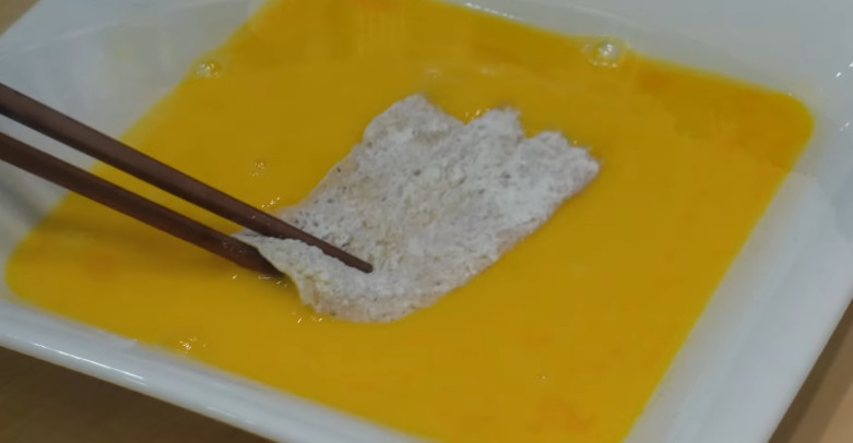 이후 밀가루를 얇게 묻힌다. 밀가루는 전분 역할만 하도록 최소한으로 사용하는 것이 좋다. 두껍게 묻히면 동태의 부드러운 식감이 사라진다. 계란물에는 소금을 넣지 않는다. 대신 계란 자체의 고소함으로 맛을 더한다.